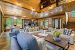 Sparrow's Nest Cabin is an enchanting residence beaming with character awaits your pleasure! Majestically surrounded by nature with lush green landscapes and mature trees for shade and privacy, Sparrow's Nest offers a remarkable lifestyle in a contemporary style with a laidback sense of sophistication. As you approach, the cabin's covered front porch welcomes you in fine form, capturing a perfected blend of traditional architecture and custom touches before you enter into the 4,000 square foot layout that houses four beds and four and half baths to comfortably sleep up to fifteen guests. Upon crossing the threshold, your eyes will carry you through the open concept layout, then upwards to the loft area above which can be viewed from the living room's voluminous 2-story ceiling. The pinnacle of style, sophistication and elegance, this cabin unites a thoughtful floor plan designed for today's lifestyle with superb amenities to create a comfort and inviting atmosphere for making memories and enjoying a pampering sense of relaxation. Bright and airy spaces, walls of glass and chic lighting convey the cabin's inviting contemporary feel, with furnishings that invite you to kick up your feet and stay awhile. With an extensive use of glass, Sparrow's Nest intimately captures the animated art, making you feel united with the tranquil beauty of the outdoors even when you are in the fully equipped kitchen whipping up snacks or meals. This gourmet kitchen is streamlined for any activity whether enjoying casual meals at its oversized granite island or whipping up family favorite meals using the premium built-in stainless appliances. Adjacent to this chef's delight is the dining area of which provides an elegant destination for more formal meals or even game nights.