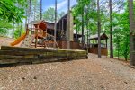 This luxe cabin has spared no expense in creating an oasis to call your home away from home, resulting in a distinct unification of spaces, even going so far as to emphasize a graceful flow of the interiors to the amazing outdoor spaces. The residence's sophisticated forward-thinking, indoor/outdoor concept mixes high-end quality finishes with a modern-rustic vibe that offers a substantial number of amenities all throughout the premises. The cozy outdoor living area is situated just steps from the indoor living room, nestled around the warmth and ambience of a gorgeous outdoor stone-front fireplace (Seasonal October-April). A grilling and alfresco dining area is steps away, as is the outdoor game area with foosball table for those with a competitive spirit. The semi-detached hot tub gazebo provides a destination for self-pampering that overlooks one of the ground's two private pond in a serene setting. When the kid's energy levels are at max, the outdoor play set will provide hours of fun with swings, a rock wall, slide and covered clubhouse. An activity both kids and adults can share is sitting down before the outdoor fire pit to roast marshmallows or tell stories of yore.
