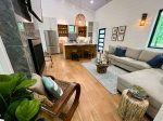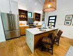 From the stainless-steel fixtures, high-end Kitchen Aid appliances, wicker and seashell lighting, custom open cabinets, and waterfall edge porcelain countertops, the designer kitchen was designed to be chic yet casual. Within this well-appointed kitchen, you will find all the small appliances, utensils, and serving dishes needed to prepare a gourmet meal or a simple late-night snack. Sit at the kitchen table and enjoy your morning coffee while your loving chef makes you a delicious breakfast (or vice versa).