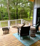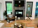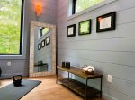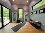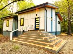 Key West Cottage was custom designed by a well-renowned Dallas architect to take advantage of the surrounding landscape to provide our guests with a unique experience that embraces both the indoors and outdoors simultaneously. The soaring ceilings of Key West Cottage are painted in a peaceful blue and the soft earth tones of the interior bring to mind the smell of the cool ocean breeze and the feel of the soft sand under your toes. The extensive use of windows and sliding glass doors not only brings the outdoors in but frames the trees to create an almost gallery-like feel inside the cabin and ever-changing art on the walls. The see-through fireplace in the living room brings even more openness and light into the space to allow you to relax and enjoy your much-needed time away. The living space is a calming and comfortable open-concept design that affords carefree living during your stay at Key West Cottage. All the furniture is sophisticated and inviting. Snuggling on the sofa, you can enjoy watching the 55” smart TV and take in the warm, soft, orange glow of the gas log fireplace. If peace of mind is your mood, just kick back and enjoy a drink and a relaxing conversation. If your mood changes, bring your drinks and move to the large backyard-covered deck and listen to the sounds of nature or relax in the fully reclining lounge chairs on the extended sun deck. If you need to recharge your soul and clear your mind, we offer a separate yoga retreat where you can go and practice your downward dog or ponder the meaning of life in the baby pose. Namaste………