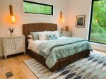 Through a 6 ft sliding glass door from the living room, you enter an oasis like no other. Encased in beautiful opulent tile from floor to ceiling, the gorgeous spa-like bathroom will not disappoint. The first feature that will draw your eye is the beautiful, free-standing 5’ round soaking tub. Lit from above by a chandelier made from Cadiz, this spacious tub will invite you to spend some quality time just relaxing to soft music or a good book. The huge walk-in shower with a large bench has two shower heads as well as a hand-held shower, again encasing you in high-end tile work that is done in soft beach tones. A free-floating James Martin double vanity with a back-lit 6-foot mirror will ensure that no sharing is needed when it is time to get ready to go and enjoy all that Key West Cottage, Sweet Serenity Resort, and Hochatown have to offer! The master bedroom, with its vaulted ceiling and expansive use of glass, provides our guests with a beautiful space to rest or catch up on their favorite tv program. The roomy and comfortable king-sized bed and soft linens will offer you a tranquil, restful night’s sleep surrounded by the quiet trees and peaceful calm of nature.