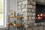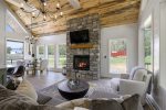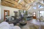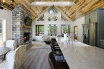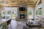 The living room is beautifully appointed with a large, modern sectional sofa that converts to a queen-sized bed when extra sleeping accommodations are needed. A swivel club chair allows guests to relax, enjoy a good book, or watch their favorite programs on the smart flat screen tv located above the gas log fireplace. The focal point of the great room is the floor to ceiling accent wall encased in natural stone that adds to the mix of natural materials that makes Kiss Me Goodnight such a unique and inviting cabin to spend your much needed getaway.
