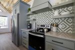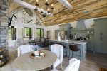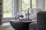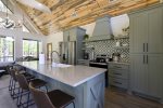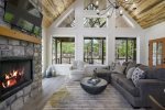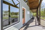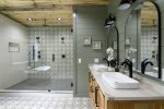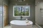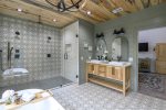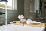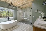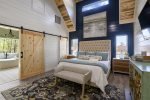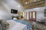 The primary suite, located through a pair of French doors, continues the tone set in the great room with vaulted ceilings, a stunning accent wall painted a rich blue, and a king size bed that one would expect to see in a five-star hotel. With ample storage, a beautiful area rug, flat screen Smart TV, and accent chair, you may never leave this space! You can also access the covered back porch directly through another set of French doors. Behind a sliding barn door, you enter what can only be described as a hidden oasis. This open and airy en suite bath will not disappoint! Double sinks, a free-standing soaking tub, and walk-in shower will make you feel as if you are in your own private spa. From the shiplap ceiling and walls, fully enclosed glass shower, and intricately tiled walls and floors, the mix of textures and materials surrounds you and instantly puts you in a Zen state.